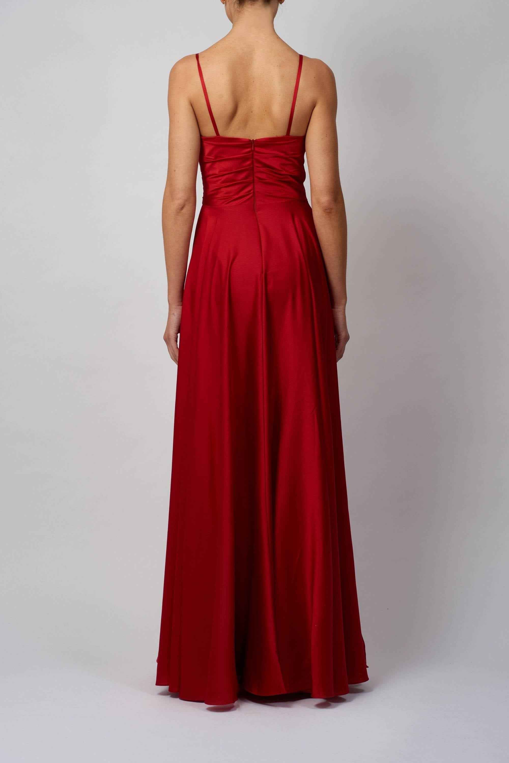 The dress features a soft V-neckline and a cross-pleated bodice that enhances the waist for a flattering, feminine silhouette. Its flowing A-line skirt offers graceful movement, while the thigh-high slit adds a modern, confident touch—perfect for evenings where you want to shine.