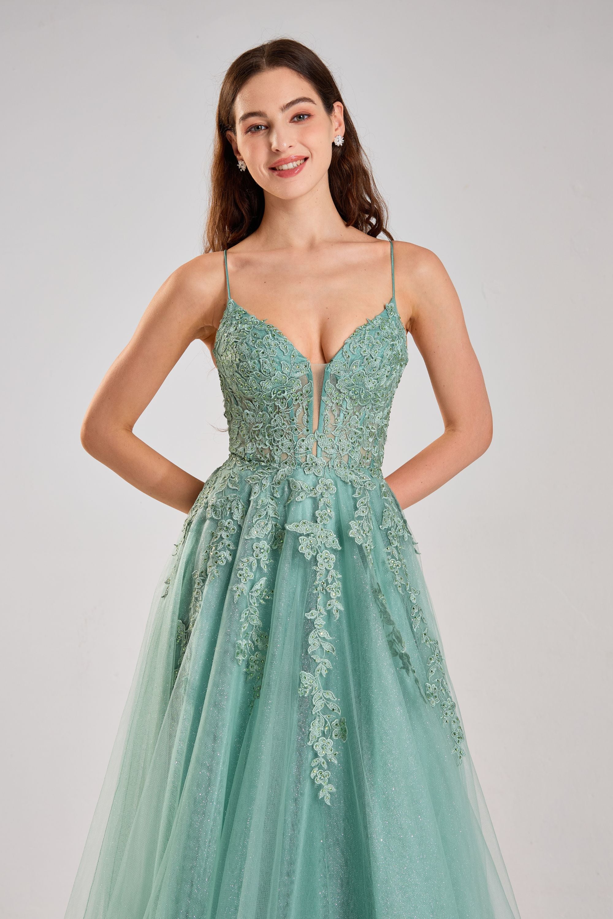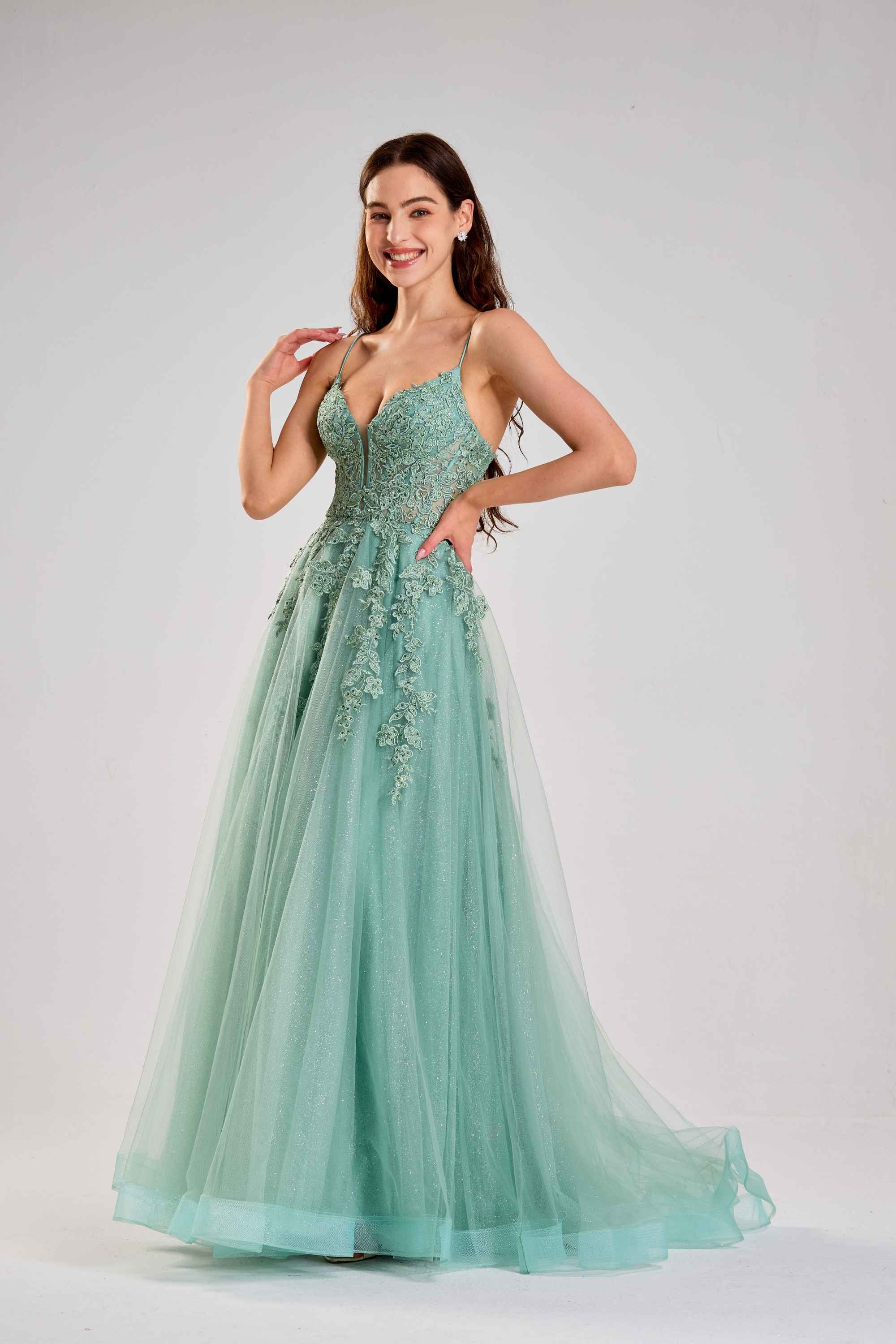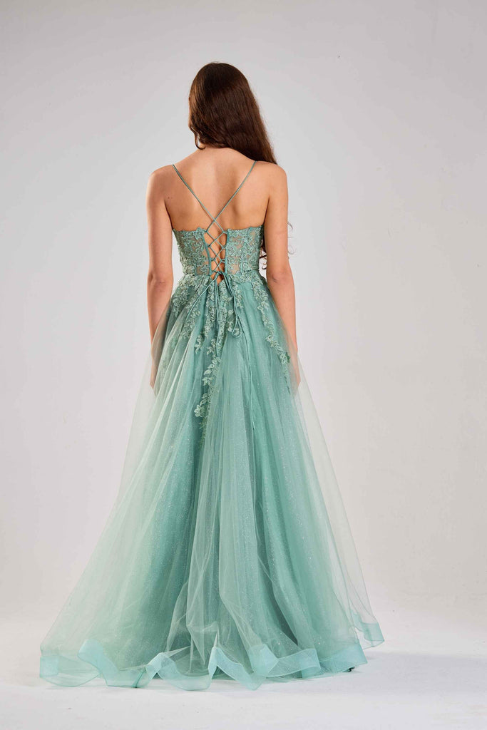 Ballkleid Joy aus Tüll mit Blumenapplikationen in Salbeigrün