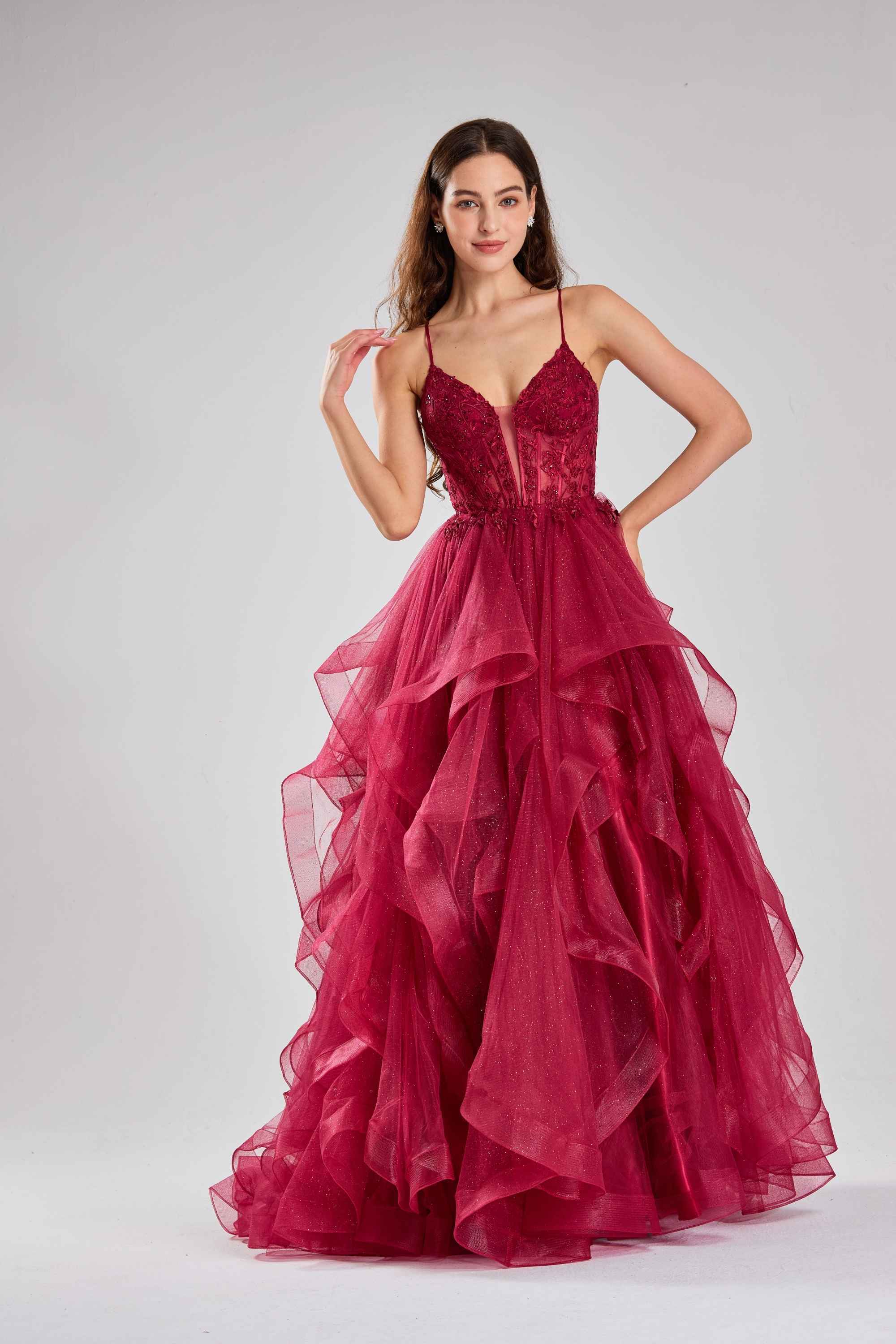 The full tiered skirt is the true highlight of this gown — layers of soft, cascading tulle create volume and movement from every angle, giving the dress a dreamy, ethereal flow. Each tier catches the light as you walk or dance, making this gown ideal for proms, red carpet events, pageants, or any special occasion where you want to stand out.