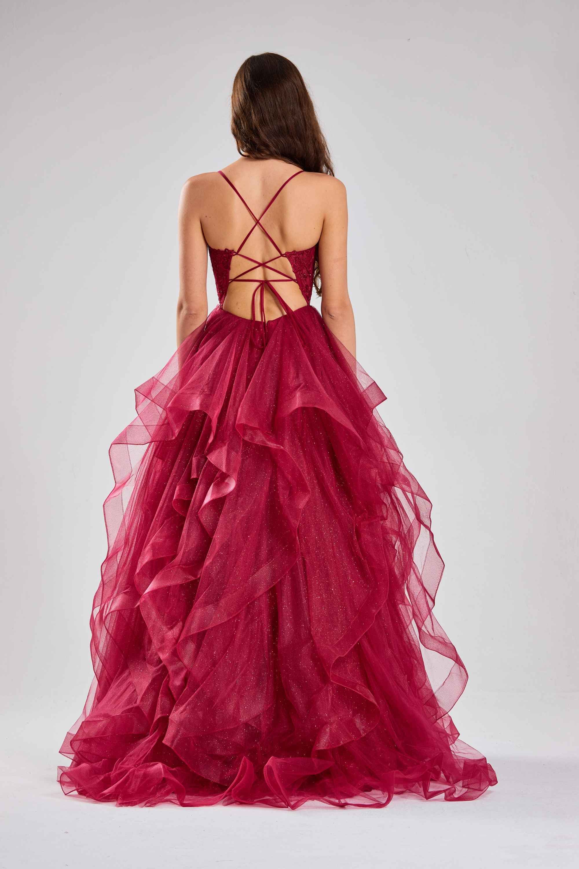 Designed to flatter, the fitted bodice accentuates the waist before flowing into a dramatic layered ball gown silhouette, ensuring a captivating shape that enhances your natural figure. The rich wine shade adds a touch of luxury and sophistication, making this gown a bold and unforgettable choice.