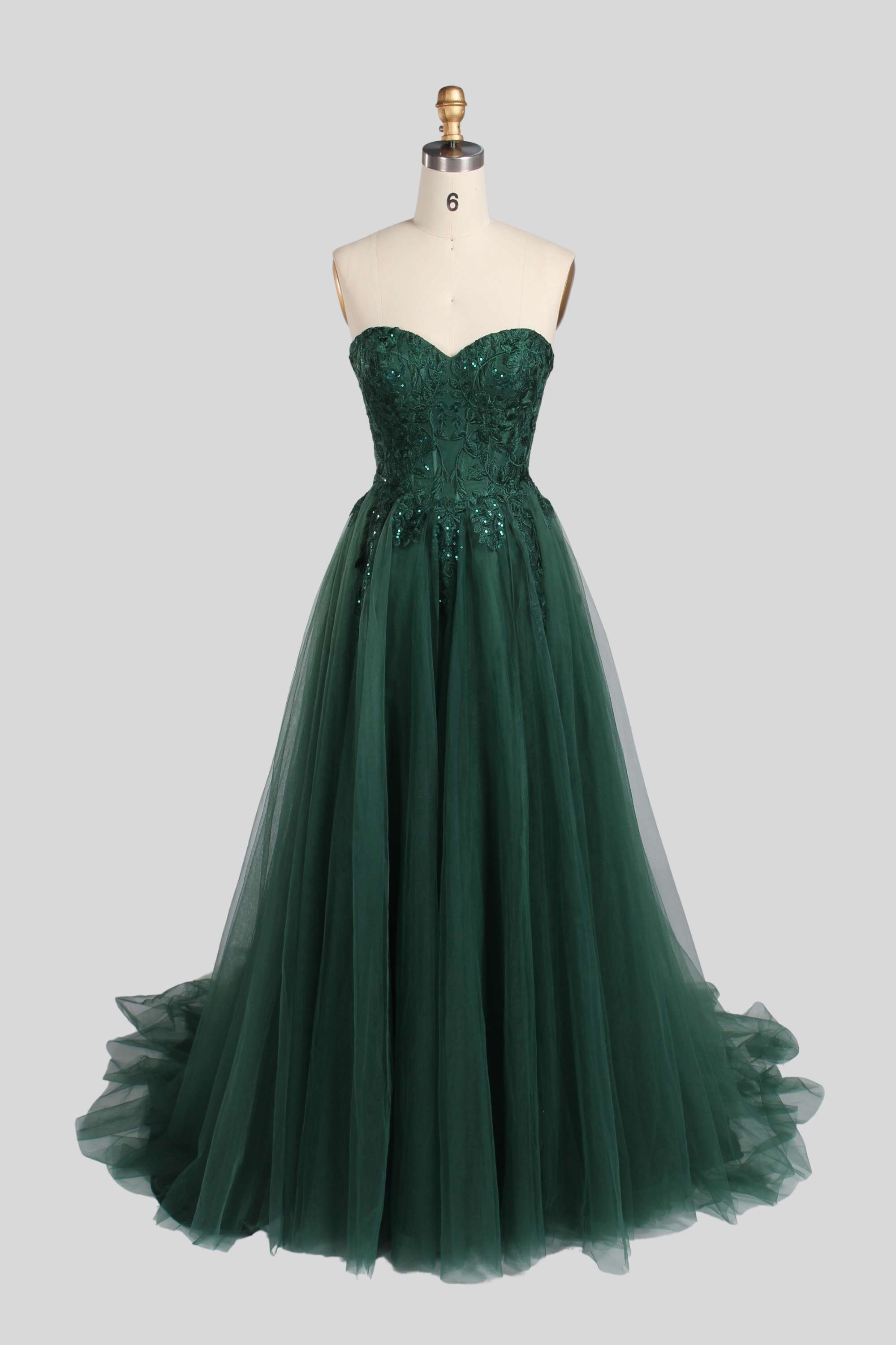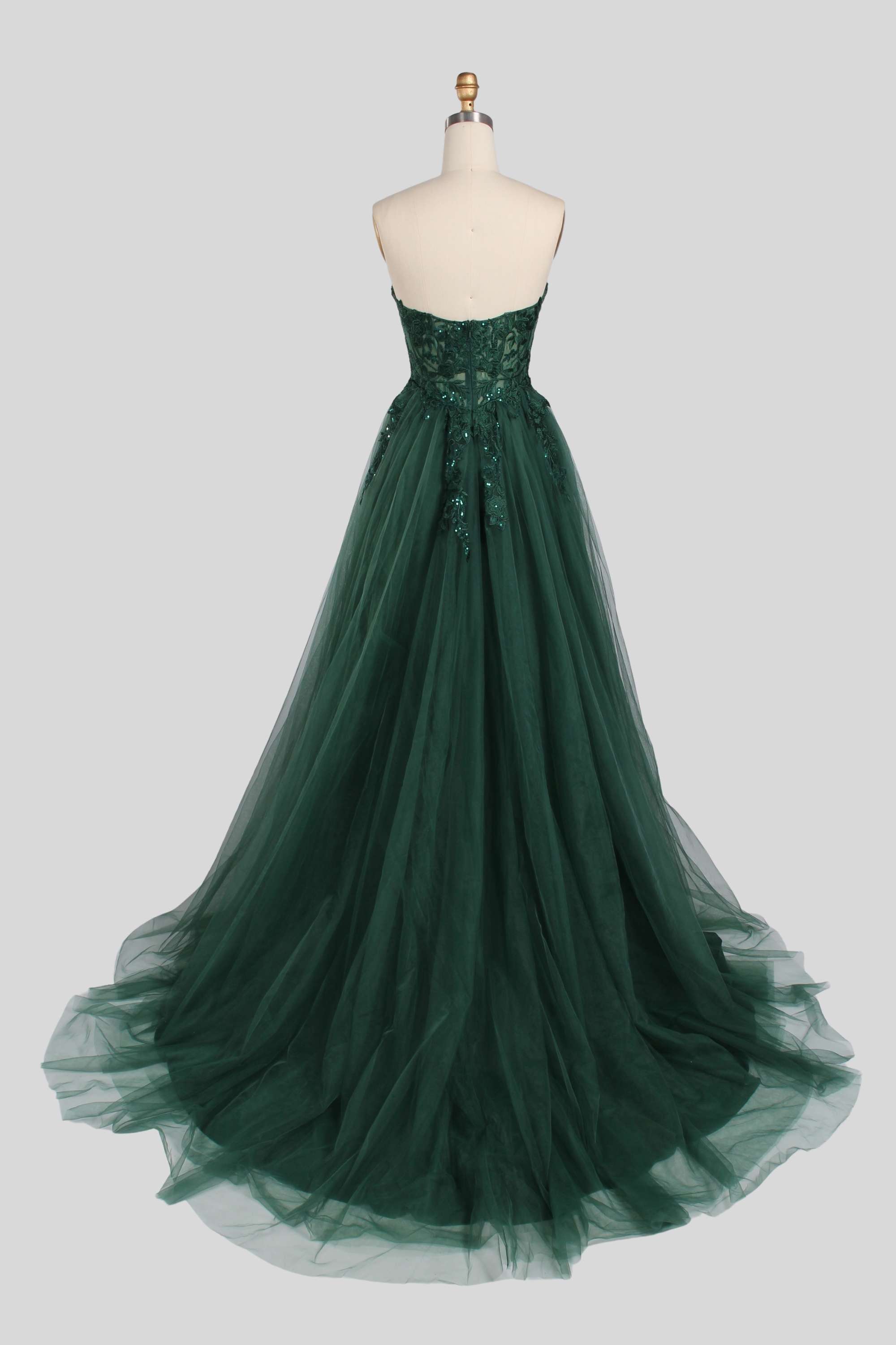 The sweetheart neckline beautifully frames your face while the intricately embroidered sequin bodice adds enchanting charm and glamour. As you glide across the floor, the tulle ballgown skirt flows gracefully, complemented by a chic high side slit, creating an entrancing silhouette that enhances your every move.