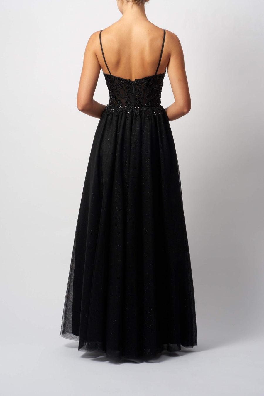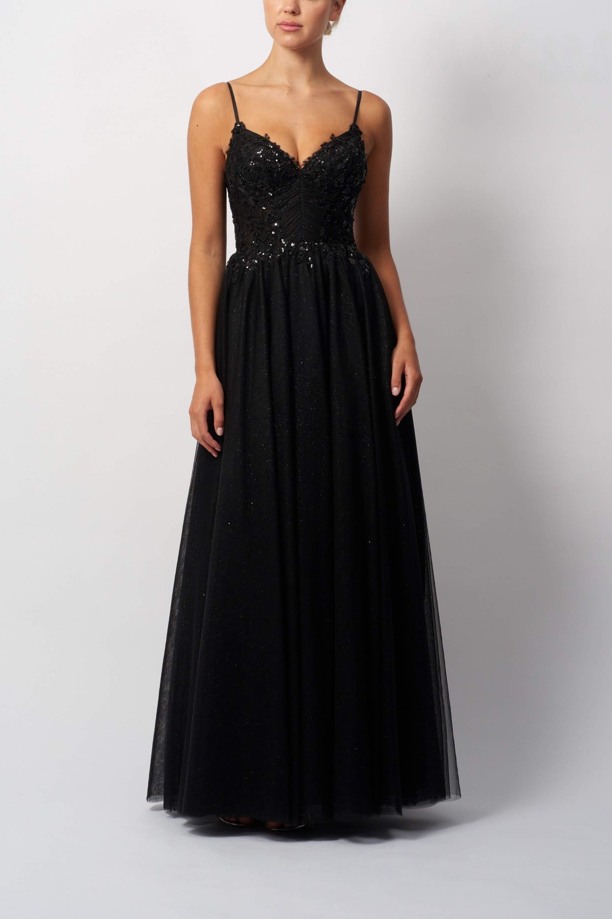 Grace meets glamour in the Mascara MC11435 Double Rouch Gown. This timeless evening dress features a delicately ruched bodice embellished with sequins and floral appliqué for a touch of sparkle. The flowing tulle skirt falls gracefully to the floor, creating a romantic and elegant silhouette that’s perfect for proms, galas, and black-tie events.