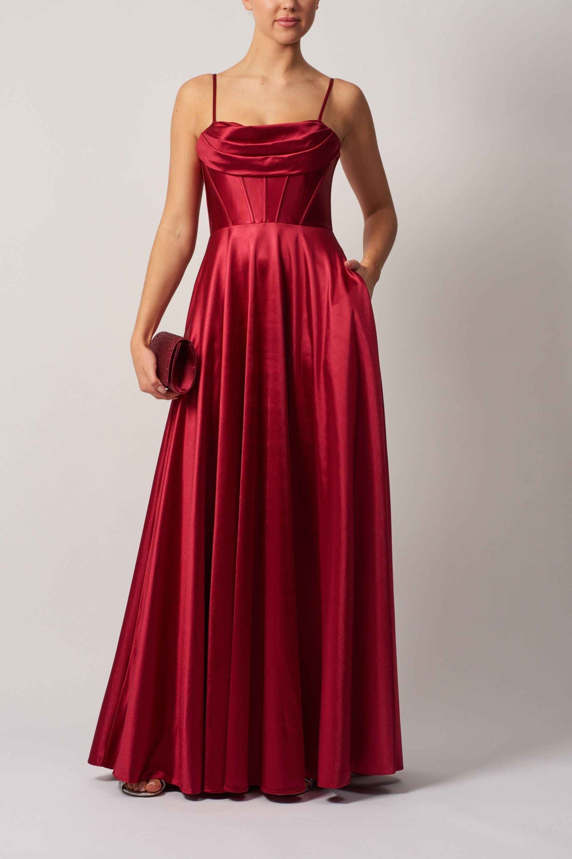 The gown showcases a soft cowl neckline, adding a modern, graceful touch to the structured bodice. Its flattering A-line silhouette flows smoothly from the waist, creating a romantic and feminine shape that suits all body types. Hidden pockets add a practical yet stylish detail, keeping the look both functional and elegant.